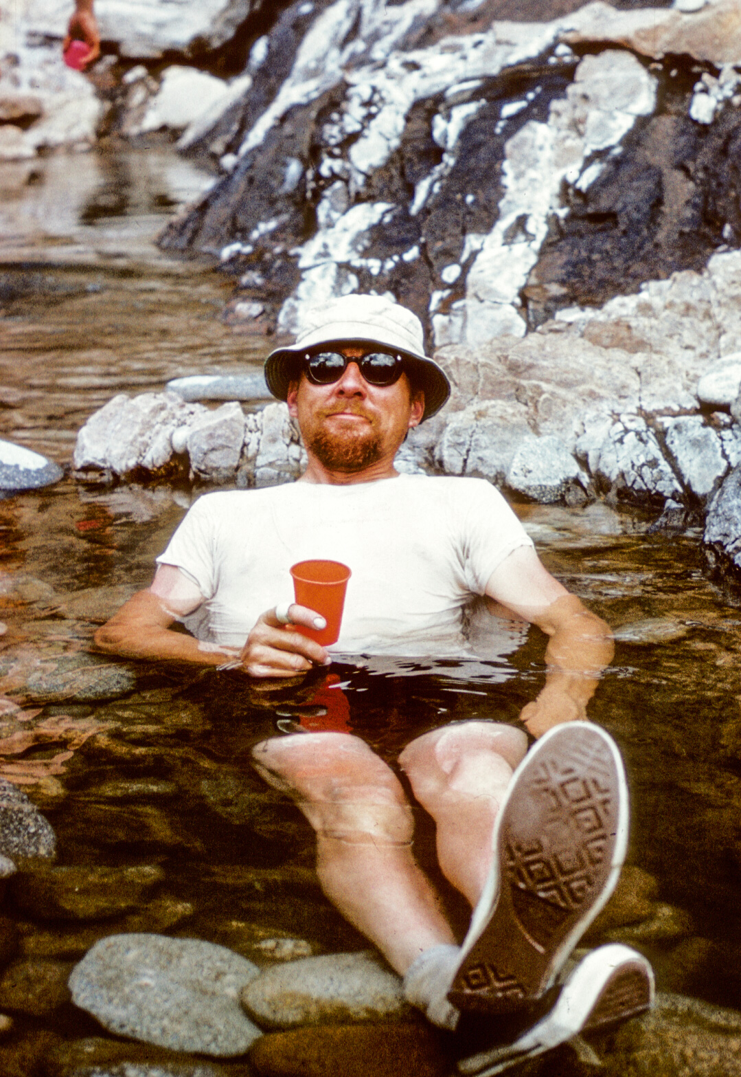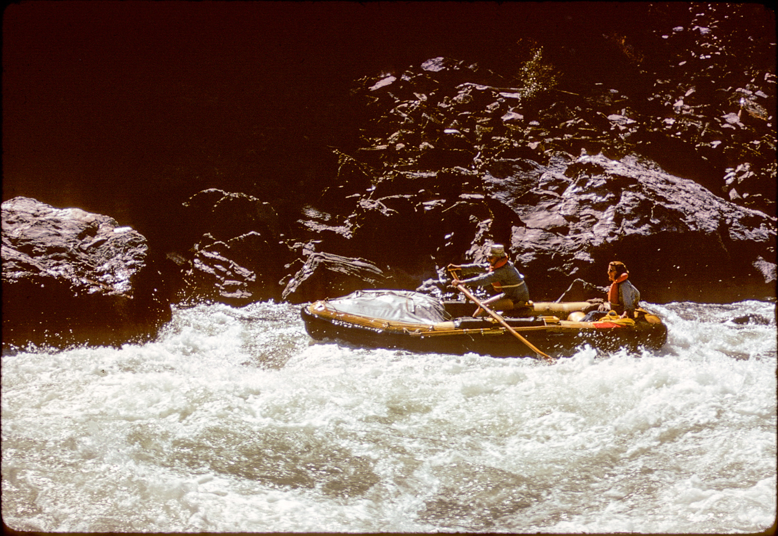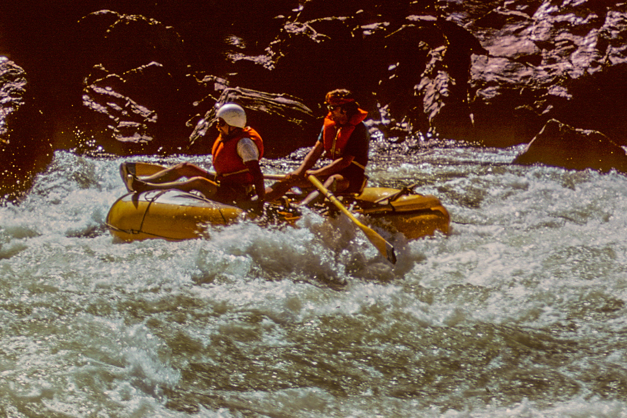 Sometime that day, below the San Miguel, I came around a corner and saw a couple of rafts. They were small below the vast Wingate cliffs, but they were very interesting to me. No one ran this stretch–what were they doing there? As we approached there was a moment of puzzled half-recognition.  Did I know this guy; he was asking himself the same question. In a moment, replacing the context, I recognized Tom Bryant, a young hotshot kayaker from Boulder. We had paddled together only a couple of times, but kayaking in those days created tribal bonds.